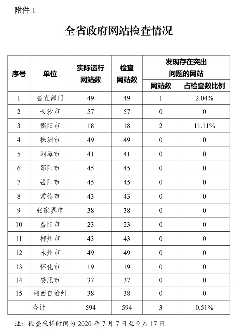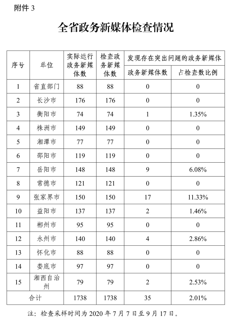 2020年第三季度,省政務局組織對全省正常運行的594家政府網站進行全覆蓋檢查,發現3家存在問題,總體合格率99.49%,其中長沙市、株洲市、湘潭市、邵陽市、岳陽市、常德市、張家界市、益陽市、郴州市、永州市、懷化市、婁底市、湘西自治州網站檢查合格率100%;對全省正常運行的1738家政務新媒體進行普查,發現35家存在問題,總體合格率97.99%,其中長沙市、株洲市、湘潭市、邵陽市、常德市、郴州市、懷化市、婁底市政務新媒體檢查合格率100%。