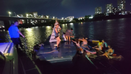 晚上七點,湘江主航道湘潭縣段內,幾名游泳愛好者正在游泳,由于夜間光線不足,船只經過時可能看不到游泳者,存在安全隱患。水上執法人員對市民進行了提醒、勸誡。