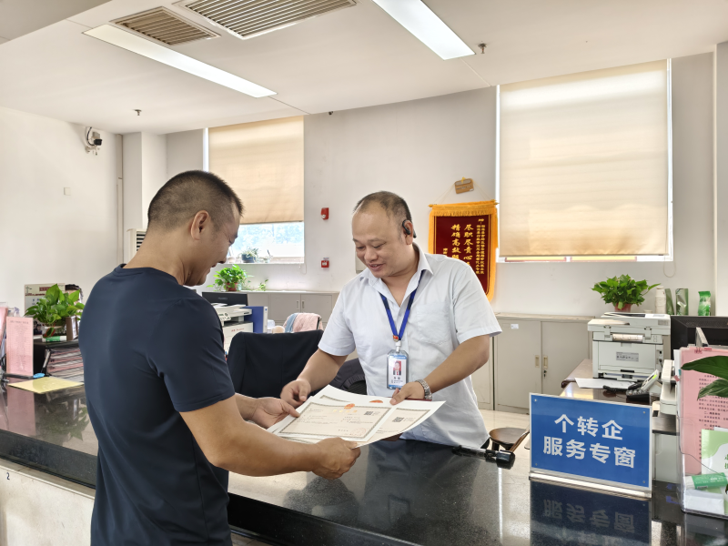 8月12日,湘潭縣市場監督管理局為原“茶恩寺鎮平平木材加工廠(個體工商戶)”經營者黃先生頒發湘潭縣首張通過“個轉企”直接變更登記的營業執照,標志著我縣個體工商戶轉型升級為企業(以下簡稱“個轉企”)改革邁出關鍵一步。該個體工商戶成功轉型為有限公司,實現“一窗受理、一次辦結”,為全縣個體工商戶高質量發展提供了新路徑。