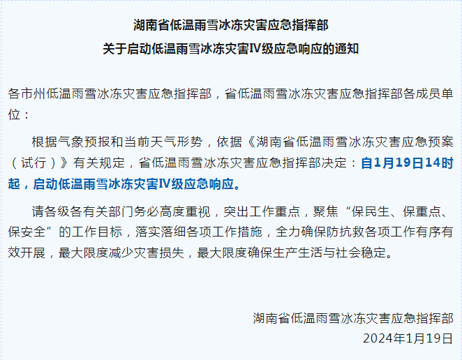 今日14時起,啟動低溫雨雪冰凍災害Ⅳ級應急響應