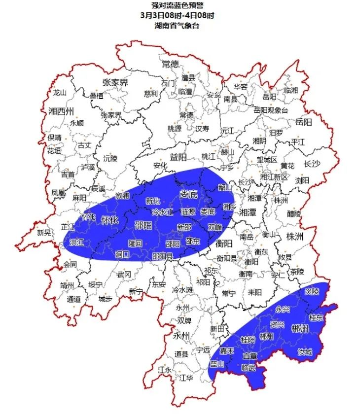 湖南省氣象臺3月3日7時51分發布強對流藍色預警:預計3日8時至4日8時,湘中、湘東南部分地區將出現8級以上雷暴大風或冰雹,伴有雷電或伴有短時強降水,請加強防范。