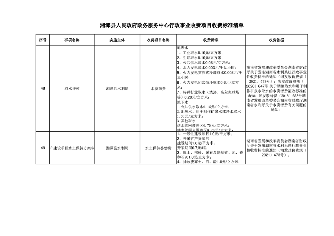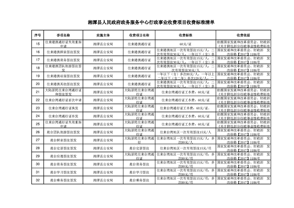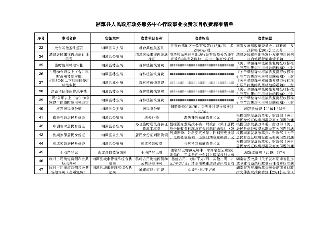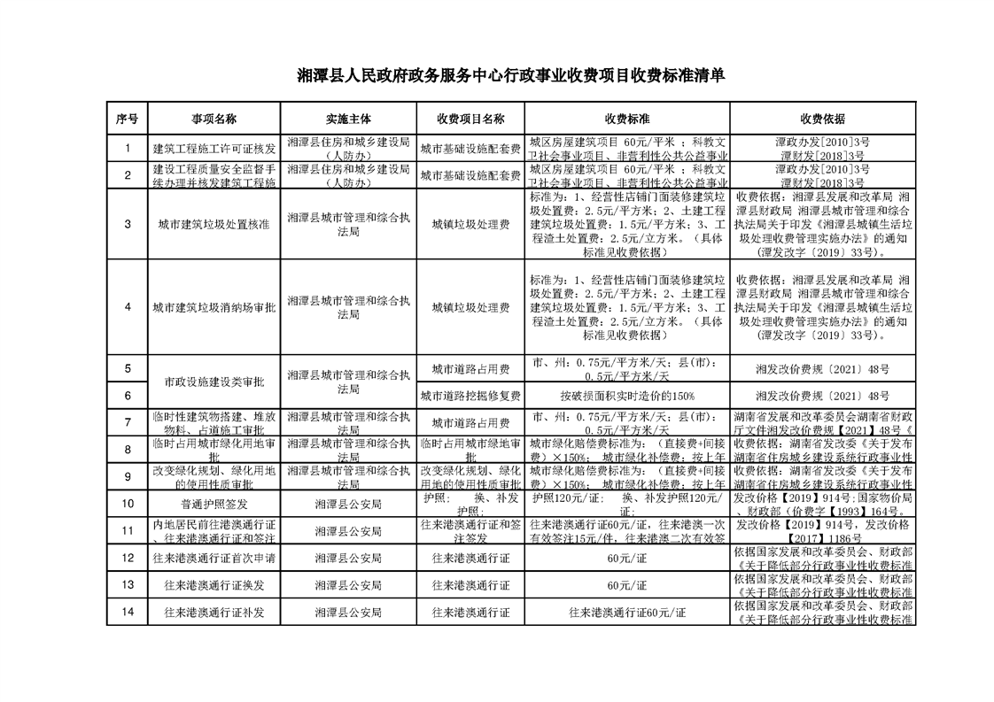 湘潭縣人民政府政務服務中心行政事業收費項目收費標準清單