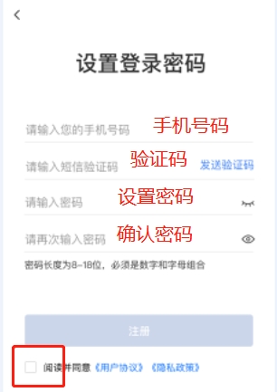 第10步:輸入手機(jī)號(hào),點(diǎn)擊發(fā)送驗(yàn)證碼,輸入收到的驗(yàn)證碼。設(shè)置登錄密碼,再次輸入密碼進(jìn)行確認(rèn),勾選用戶協(xié)議和隱私政策,點(diǎn)擊注冊(cè)后,便完成了注冊(cè)。