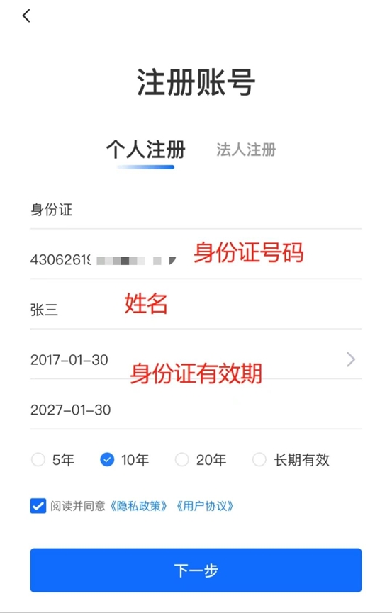 第9步:輸入姓名、身份證號(hào),根據(jù)身份證反面信息選擇證件有效開始時(shí)間和身份證使用年限,點(diǎn)擊“下一步”。