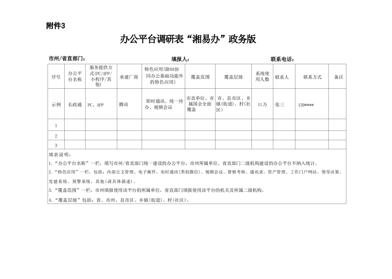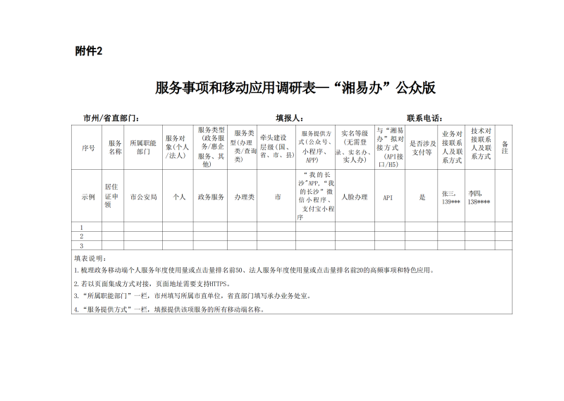 (三)全面摸清需求,完善頂層設計。各地各部乓險媸嶗肀鏡乇靜棵耪穹瘛⒐卜袷孿詈駝穹褚貧τ孟低誠腫矗⒍園旃教ń械餮忻祝既誹钚礎斗袷孿詈鴕貧τ玫餮斜懟�(附件2)及《辦公平臺調研表》(附件3),并做好相關事項和服務接入準備工作。項目組要在充分摸清需求的基礎上,按照“一體設計、分步實施”的原則,完善“湘易辦”頂層設計,加強與全國一體化平臺移動端有效銜接,推動各地各部門移動政務服務資源整合和政務服務平臺移動端集約化建設,全面提升一體化政務服務能力。