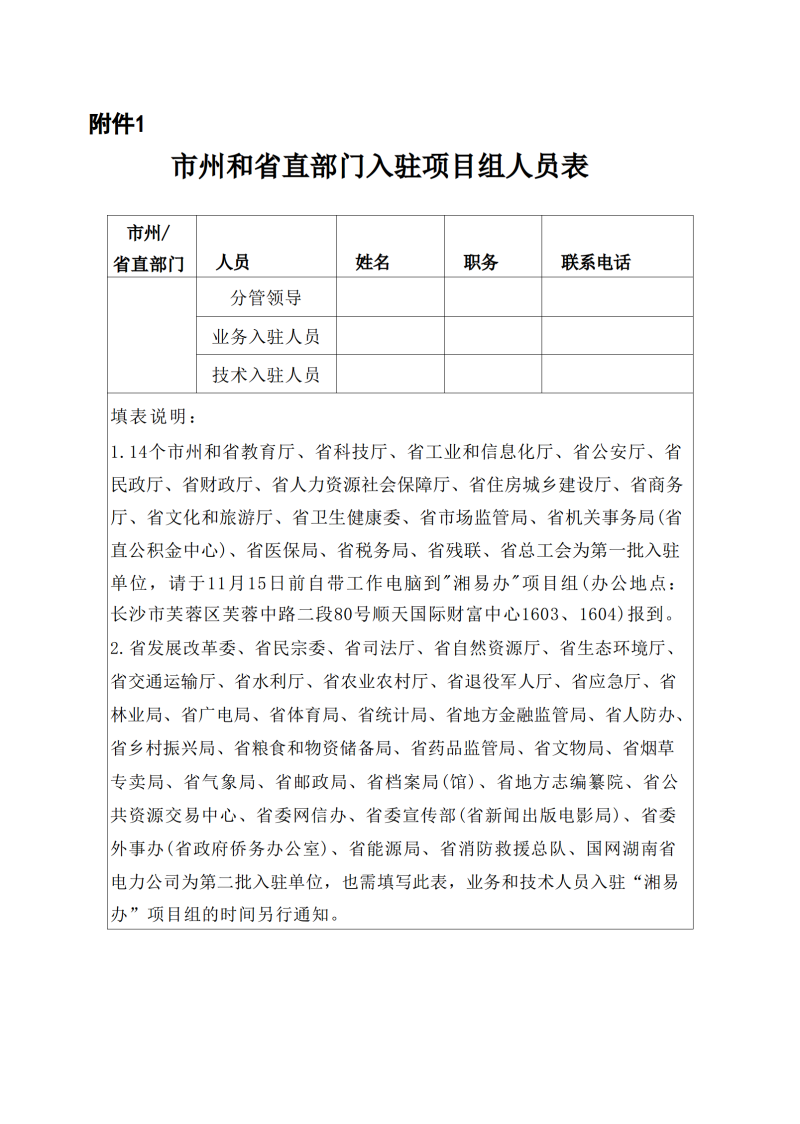 (二)建立項目推進組,集中攻堅推進。以建行湖南省分行技術團隊為主體,組建“湘易辦”項目組,集中攻堅推進項目建設。省政務局、省政務服務和大數據中心、省中小企業服務中心等單位分管領導及相關處室負責人進駐“湘易辦”項目組,集中辦公,負責具體協調、工作調度、現場解決相關問題。市州和省直相關部門(名單見附件1)要明確1名領導負責統籌協調工作,研究解決本級本部門對接“湘易辦”過程中的相關問題,并安排1名信息化建設相關處室(科室)負責人和1名熟悉本部門業務工作的骨干人員在2022年11月15日前集中進駐項目組,代表本地本部門做好溝通聯絡和對接,組織調度工作力量梳理服務事項、服務應用、惠企政策并編制兌現指南,完成自建系統的對接改造,提供相關數據支撐,并配合做好服務上線測試等工作,直至本地本部門相關任務完成為止。
