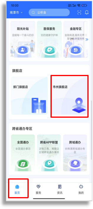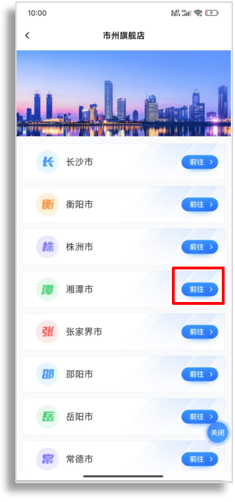 (3)實名認證完成后,進入首頁,向下滑動頁面,找到“市州旗艦店”點擊并進入,找到“湘潭市”,點擊“前往”。
