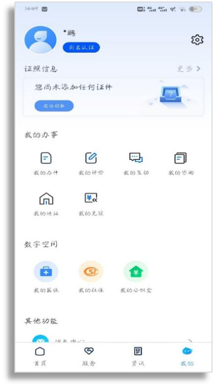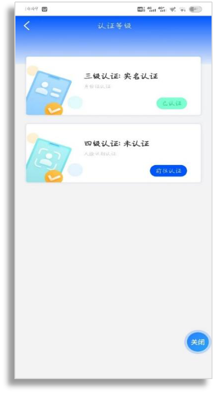 (2)下載成功后需完成注冊、登錄、實名認證操作。登錄后進入“我的”專區,點擊“實名認證”,選擇“三級認證:實名認證”進行身份證綁定。(注:獲取電子票據必須完成實名認證)
