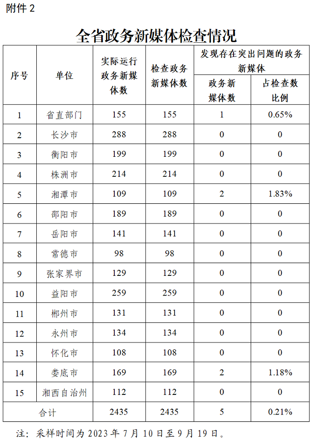對(duì)全省正常運(yùn)行的2435家政務(wù)新媒體進(jìn)行普查,發(fā)現(xiàn)5家存在突出問(wèn)題,總體合格率為99.79%。長(zhǎng)沙市、衡陽(yáng)市、株洲市、邵陽(yáng)市、岳陽(yáng)市、常德市、張家界市、益陽(yáng)市、郴州市、永州市、懷化市、湘西自治州政務(wù)新媒體檢查合格率100%。