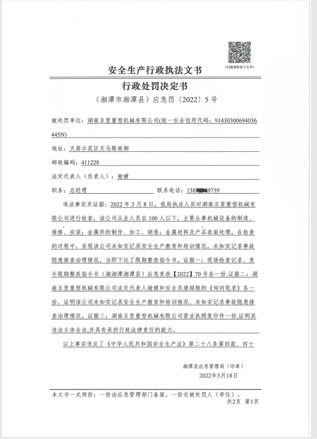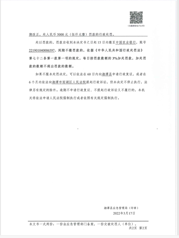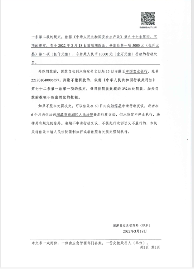 湘潭縣應急管理局2022年上半年行政處罰決定書