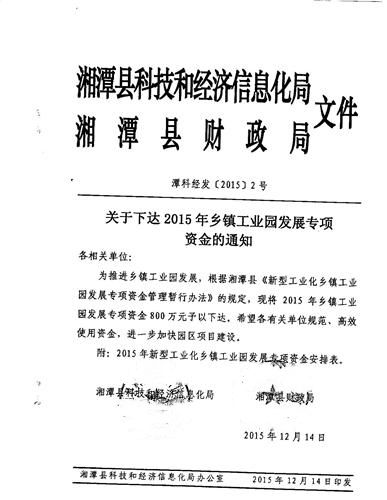湘潭縣經(jīng)濟(jì)和信息化局關(guān)于下達(dá)2015年鄉(xiāng)鎮(zhèn)工業(yè)園發(fā)展專項(xiàng)資金的通知