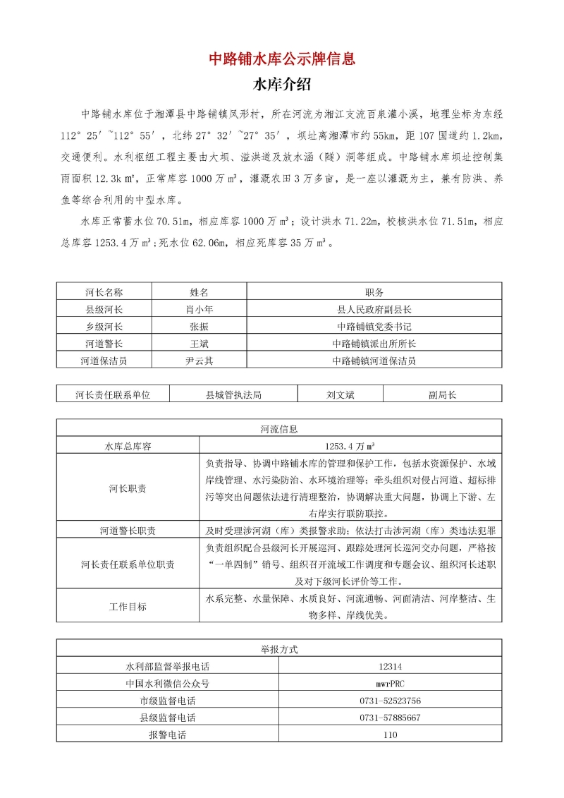 湘潭縣水利局發布中路鋪水庫公示牌信息