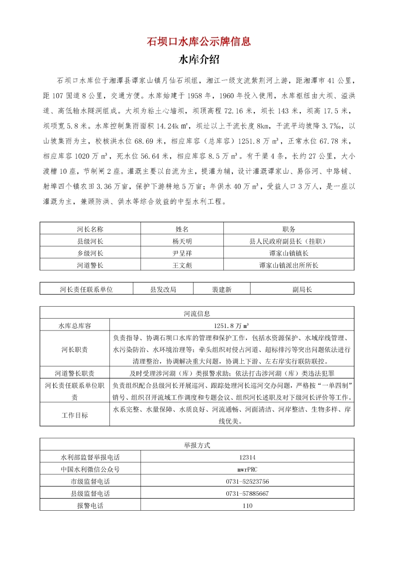湘潭縣水利局發(fā)布石壩口水庫公示牌信息