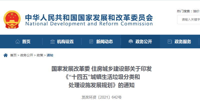 國家發展改革委、住房城鄉建設部日前發布《“十四五”城鎮生活垃圾分類和處理設施發展規劃》提出,到2025年底,全國城市生活垃圾資源化利用率達到60%左右;到2025年底,全國生活垃圾分類收運能力達到70萬噸/日左右,基本滿足地級及以上城市生活垃圾分類收集、分類轉運、分類處理需求,并鼓勵有條件的縣城推進生活垃圾分類和處理設施建設;到2025年底,全國城鎮生活垃圾焚燒處理能力達到80萬噸/日左右,城市生活垃圾焚燒處理能力占比65%左右。