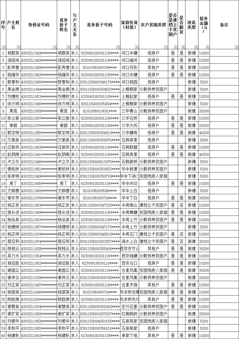 湘潭縣河口鎮2019年第三批危房改造資金發放表公示