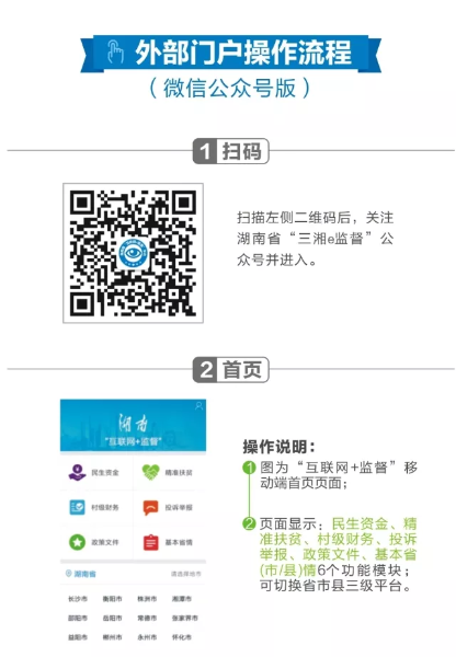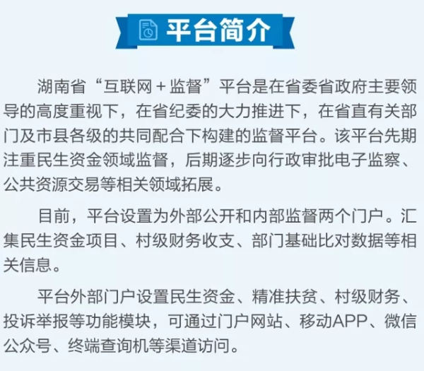 湖南省“互聯(lián)網(wǎng)+監(jiān)督”平臺(tái)于2017年11月14日正式啟動(dòng)上線,是省委、省政府為深化“雁過(guò)拔毛”式腐敗問(wèn)題專項(xiàng)整治的一項(xiàng)創(chuàng)新舉措,該平臺(tái)圍繞“錢從哪里來(lái),花到哪里去、干了什么事、效果怎么樣、有沒(méi)有問(wèn)題”這條主線,將各類民生資金,特別是扶貧資金的撥付、發(fā)放和使用情況全面公開(kāi),實(shí)現(xiàn)對(duì)每筆資金從上至下、從部門到農(nóng)戶到個(gè)人到項(xiàng)目的全程監(jiān)督。群眾可通過(guò)平臺(tái)門戶網(wǎng)站、移動(dòng)APP、“三湘e監(jiān)督”微信公眾號(hào)等途徑,選擇所在市、縣、鎮(zhèn)、村名,輸入姓名或身份證號(hào)就可以查詢到政府發(fā)放的補(bǔ)貼款項(xiàng)、民生工程和扶貧項(xiàng)目的各種資金發(fā)放情況,足不出戶地對(duì)民生、扶貧資金使用、發(fā)放情況進(jìn)行實(shí)時(shí)監(jiān)督。